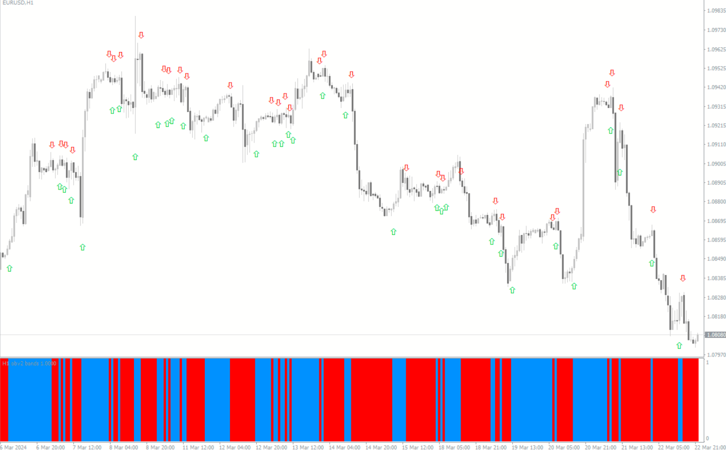 On an EUR/USD H1 chart, the OBV MA Histo MTF Arrows Alerts Indicator shows a rising positive histogram along with an upward arrow. This confirms strong buying volume and supports a buy trade. When the histogram later weakens and a downward arrow appears, it signals a possible exit or sell opportunity.