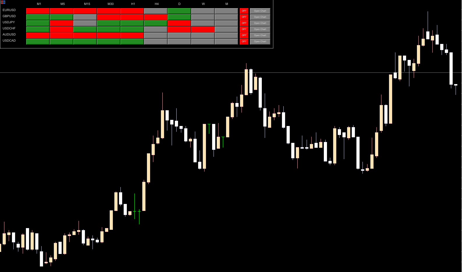 On the GBPUSD H4 chart, the dashboard highlights current BULLISH or BEARISH conditions through colored signals. By reading the table, traders can instantly understand the trend of any currency pair on any timeframe without manually opening multiple charts.