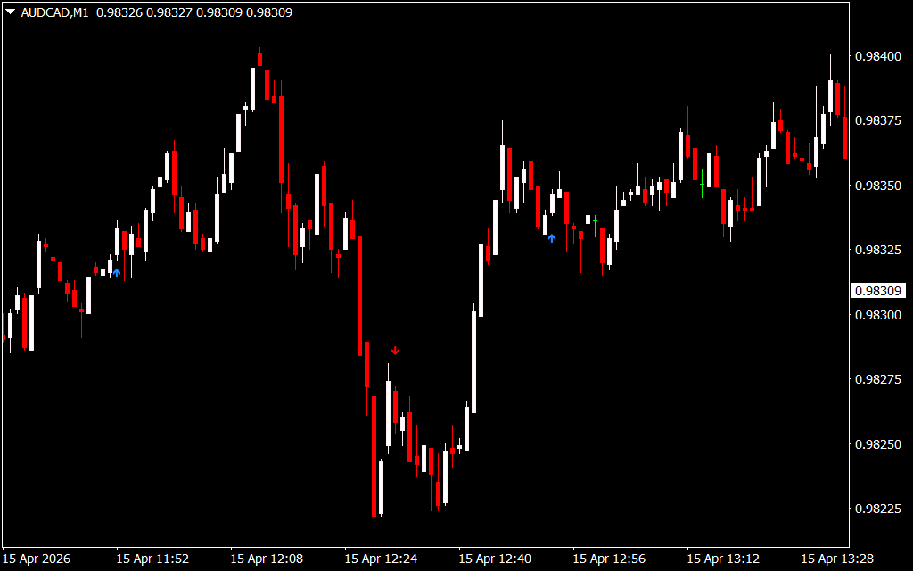 As shown in the AUD/CAD M1 chart analysis, the indicator works by identifying key momentum shifts and Price Action triggers, marking them with clear visual cues: