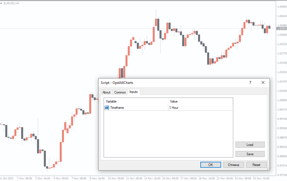 For instance, if your Market Watch contains EURUSD, GBPUSD, USDJPY, and AUDUSD, running the script on a EURUSD chart will automatically open all four charts at your chosen timeframe. This allows you to start analyzing price movements immediately or attach EAs without additional setup.