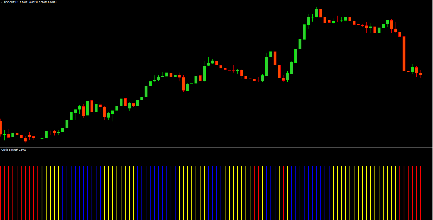 At its core, the Oracle Strength Indicator for MT4 displays a sequence of color-coded bars in a separate window below the main price chart. Each color represents a different type of market movement: