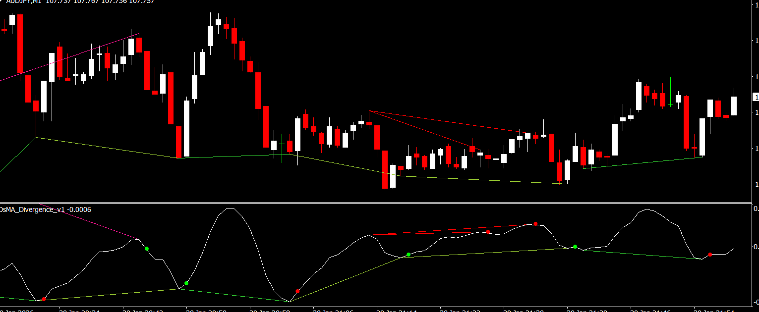 The OSMA Divergence Indicator automatically scans price movements and OSMA values to detect bullish and bearish divergence. When divergence is identified, the indicator visually marks it on the chart, making it easy for traders to spot potential trade setups.