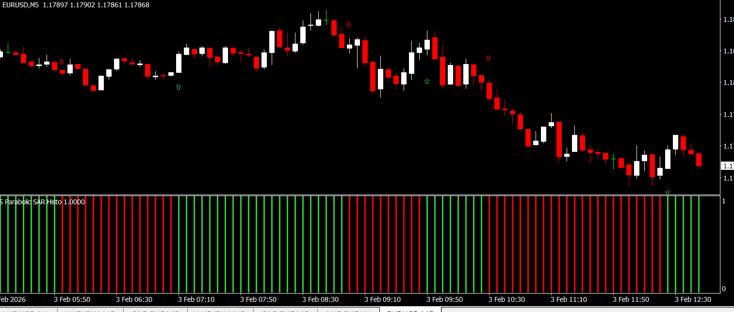 The histogram visually shows whether the SAR is rising or falling, making trend changes easy to spot. Additionally, arrow alerts notify traders in real time when a potential Trend Reversal occurs.