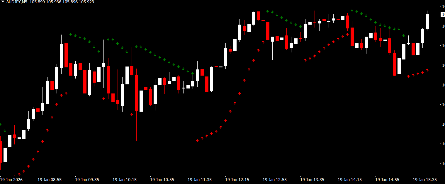 Once installed on MT4, the indicator automatically plots colored dots on the chart.