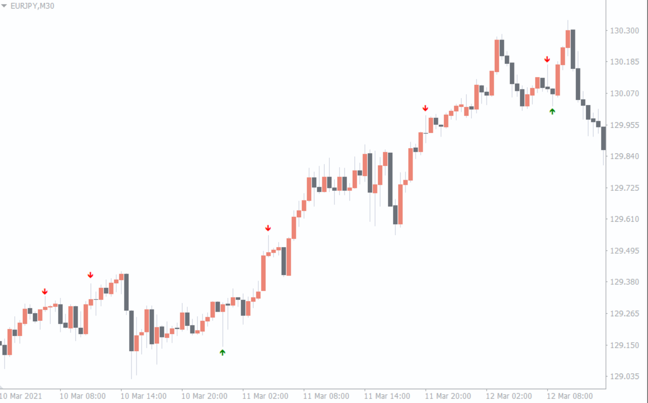 For example, in an EUR/USD M30 chart, the indicator identifies the location of the pinbar and immediately marks it with the corresponding arrow. Traders can then place trades in the direction of the reversal.
