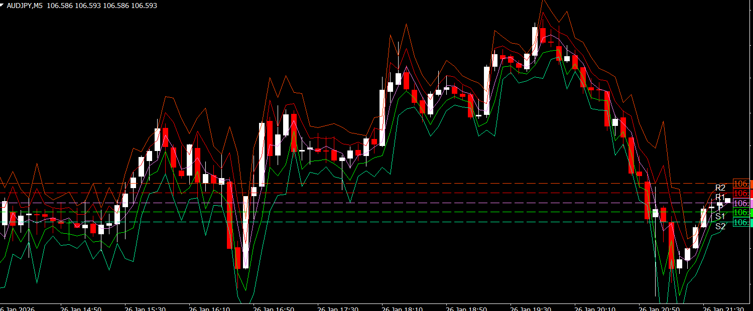 Once calculated, the indicator plots the pivot point and multiple support/resistance levels directly on the chart, giving traders a visual representation of where Price Action might reverse or continue.