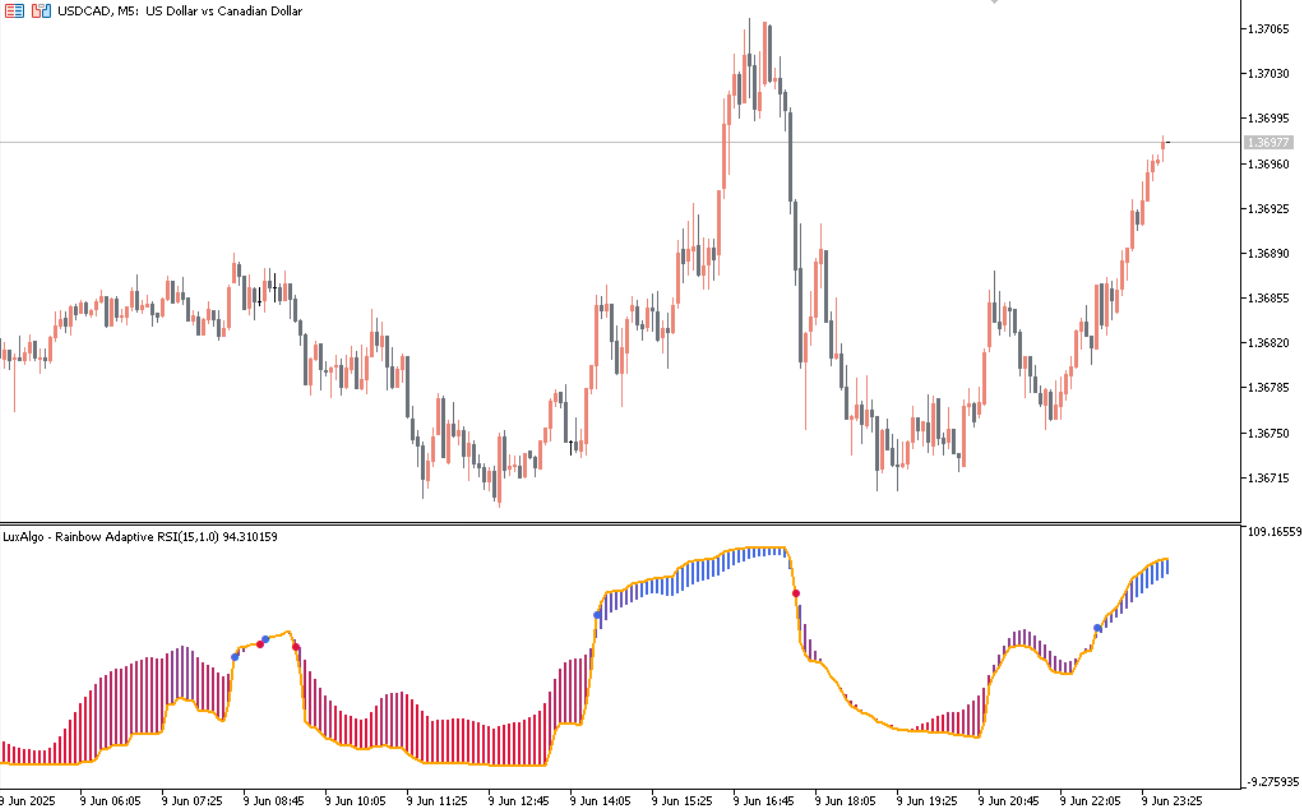 The Rainbow Adaptive RSI Indicator MT5 revolutionizes momentum trading by merging adaptive RSI logic with intuitive visual cues. Developed by LuxAlgo, it offers unmatched insight into real-time price pressure, trend continuations, and exhaustion zones.