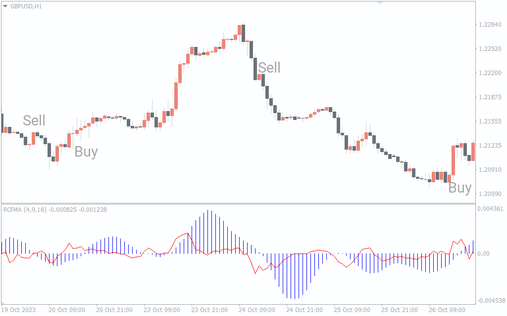 The RCF MA plots blue histogram bars around a central ZERO level, accompanied by a red signal line. This simple yet powerful visualization helps traders identify market direction with ease.