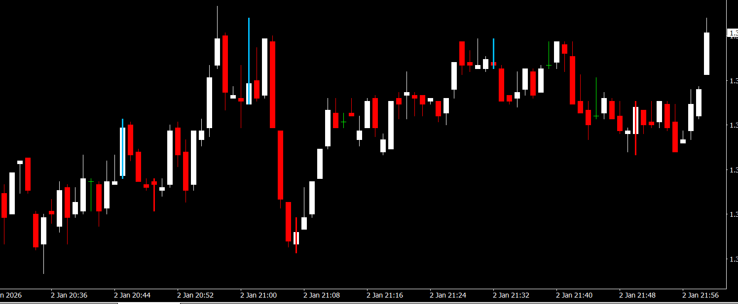 The indicator continuously analyzes price movements to detect changes in market direction. When it identifies a reversal pattern, it immediately displays the appropriate colored bar on the chart.