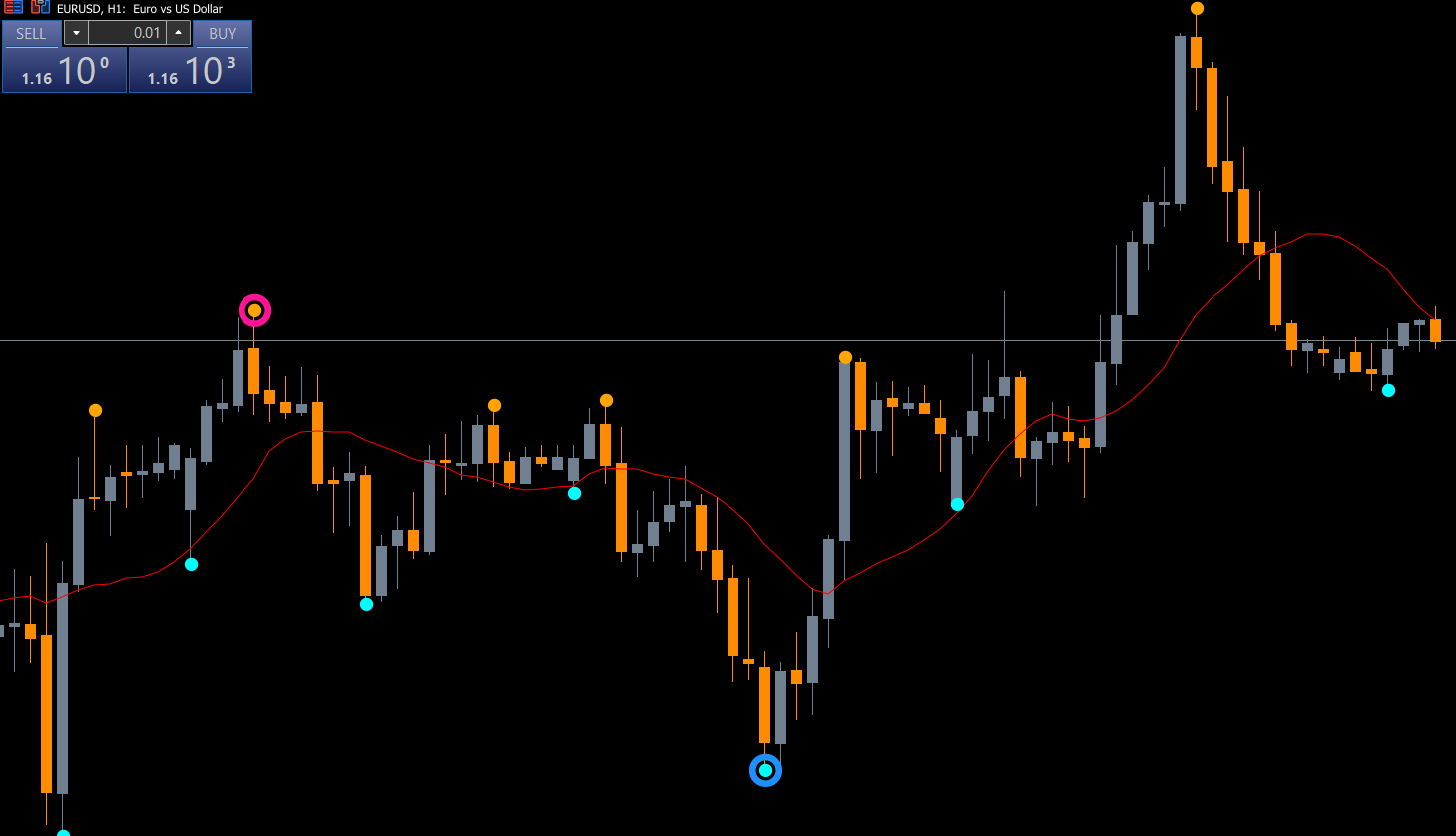 For example, to enter a long trade, a trader would wait for a green dot on the chart, indicating a potential bullish reversal. The trader can then confirm the entry with a bullish candlestick pattern before opening a position. Conversely, a red dot signals a potential bearish reversal, which can be confirmed with a bearish candlestick pattern.