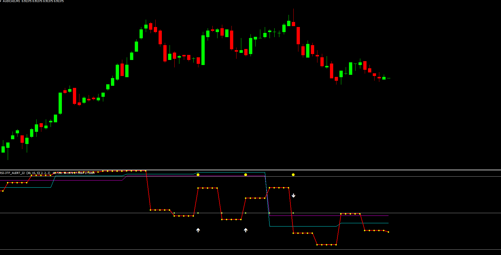 If an up arrow appears while RSI values remain below the 50 level, the signal is considered weak and should be filtered or ignored.