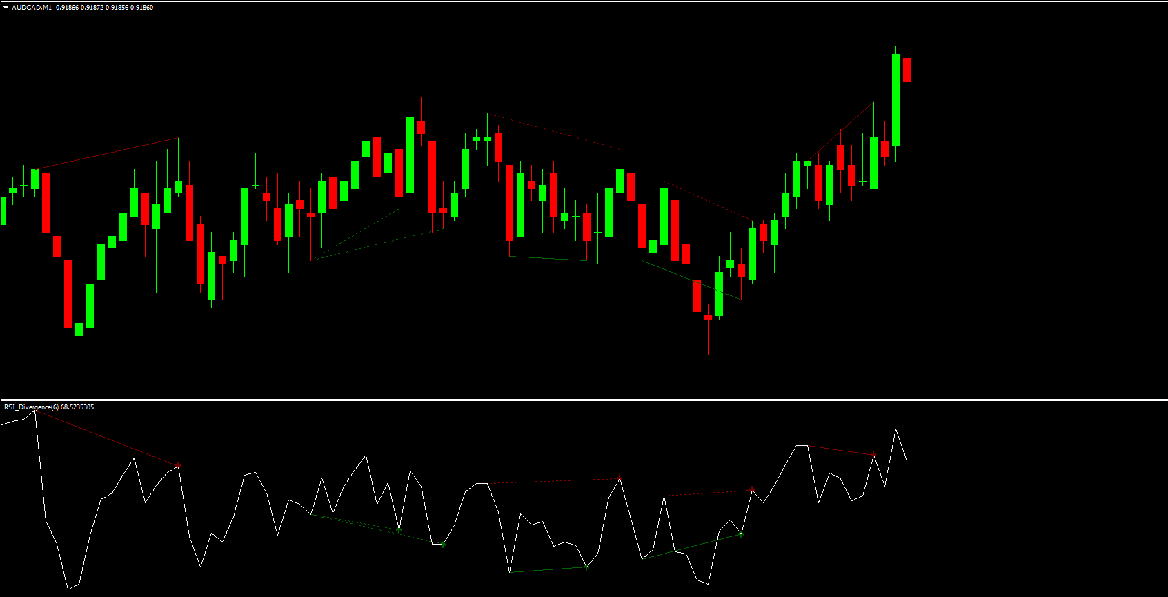 This indicator plots divergence lines in a separate window on the chart. The green lines indicate bullish divergence, suggesting upward momentum, while the red lines indicate bearish divergence, signaling potential downward movement. By using these signals, traders can enter trades at optimal points and manage risk more effectively.