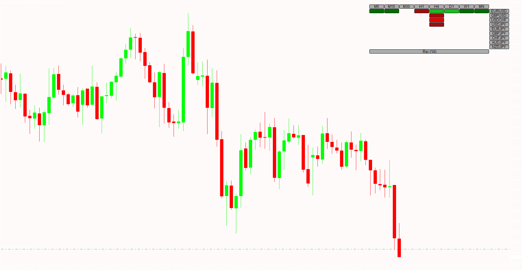 The indicator displays RSI values for multiple currency pairs in a single view, making it easy to compare relative strength and weakness across the forex market.