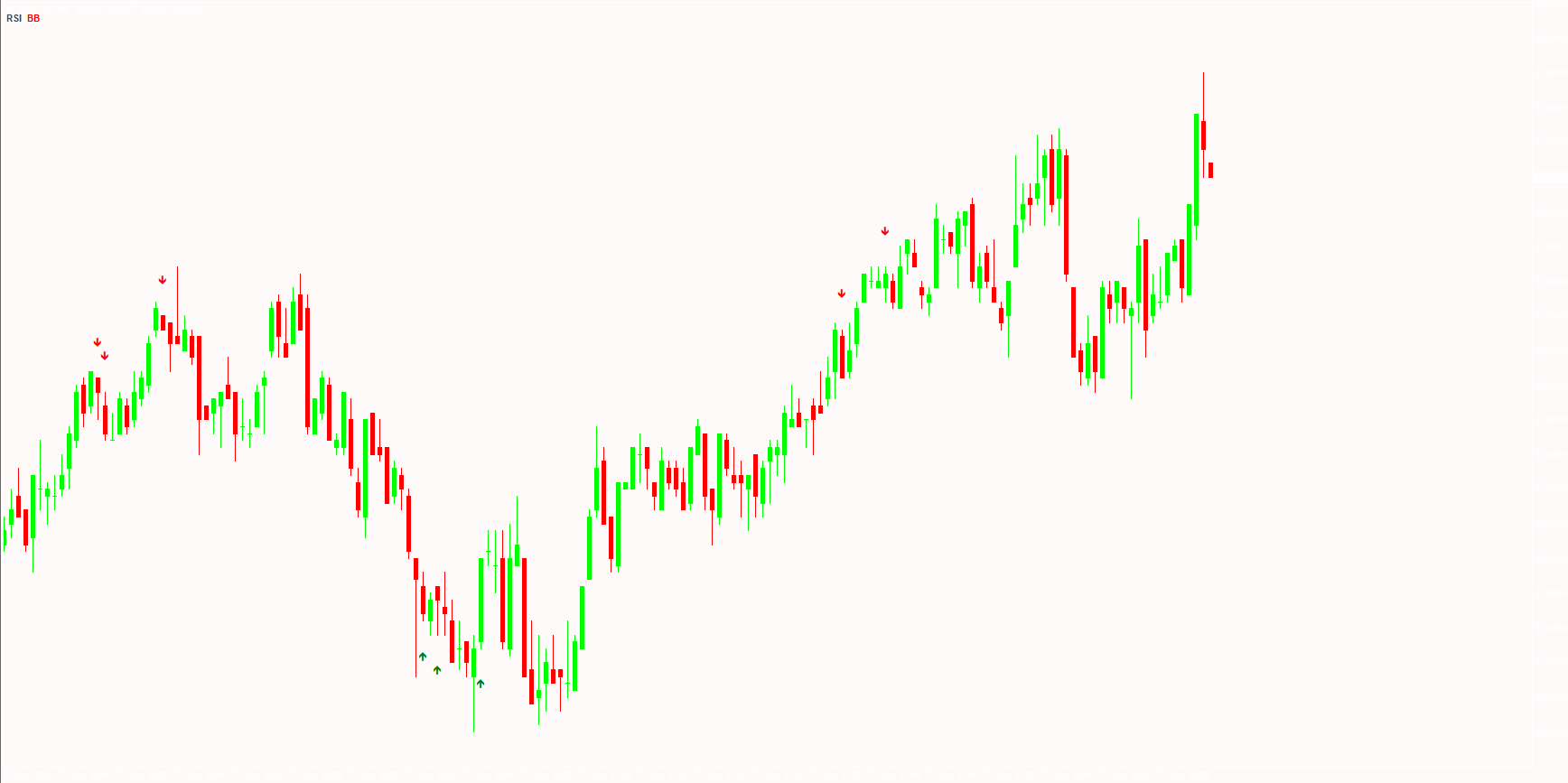When RSI rises above the 70 level, the market is considered overbought. At this point, the indicator plots a RED arrow, suggesting that bullish momentum may be exhausted and a bearish reversal could occur.