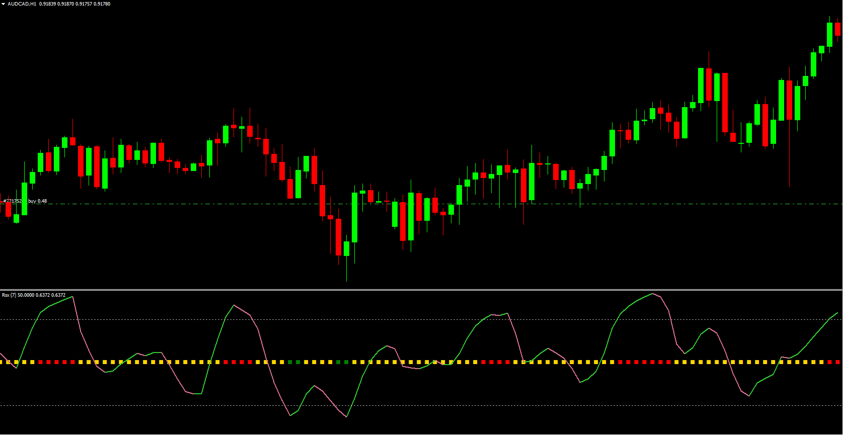 Consider a chart of GBP/AUD. When the RSX indicator’s center line turns green, it signals bullish pressure. Simultaneously, the moving average turns lime green and aligns with upward price movement—an ideal time to consider buying.
