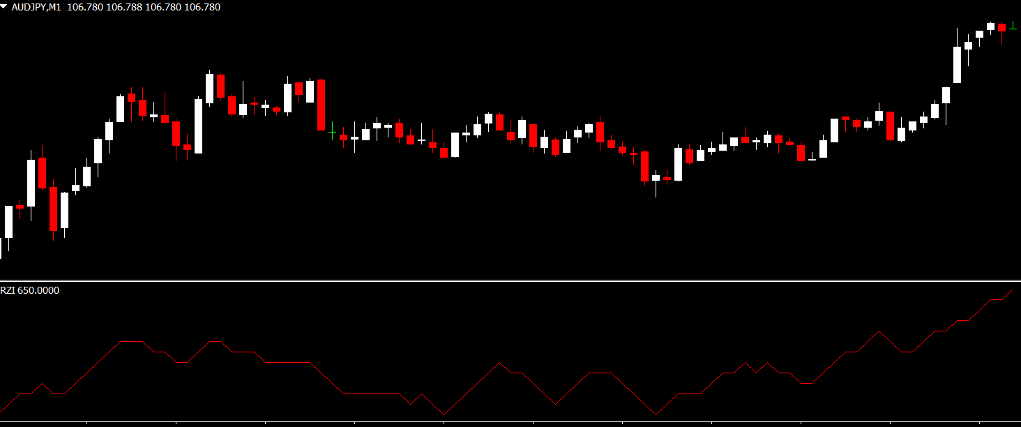 The RZI Indicator plots a histogram directly on the MT4 chart. Each bar represents the strength of the market’s momentum at a given moment.