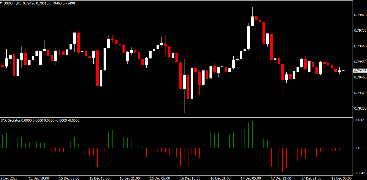 The SAR Oscillator plots a line around a zero level to indicate short‑term bullish or bearish momentum. Values above zero point to upward bias, while values below zero show downside pressure.