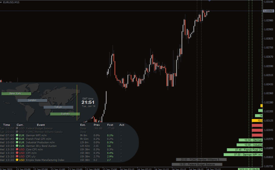 The Scouts News Indicator generates real-time alerts and visual signals based on upcoming economic announcements. All events are categorized according to impact level—low, medium, or high—helping traders immediately identify which events may move the market.