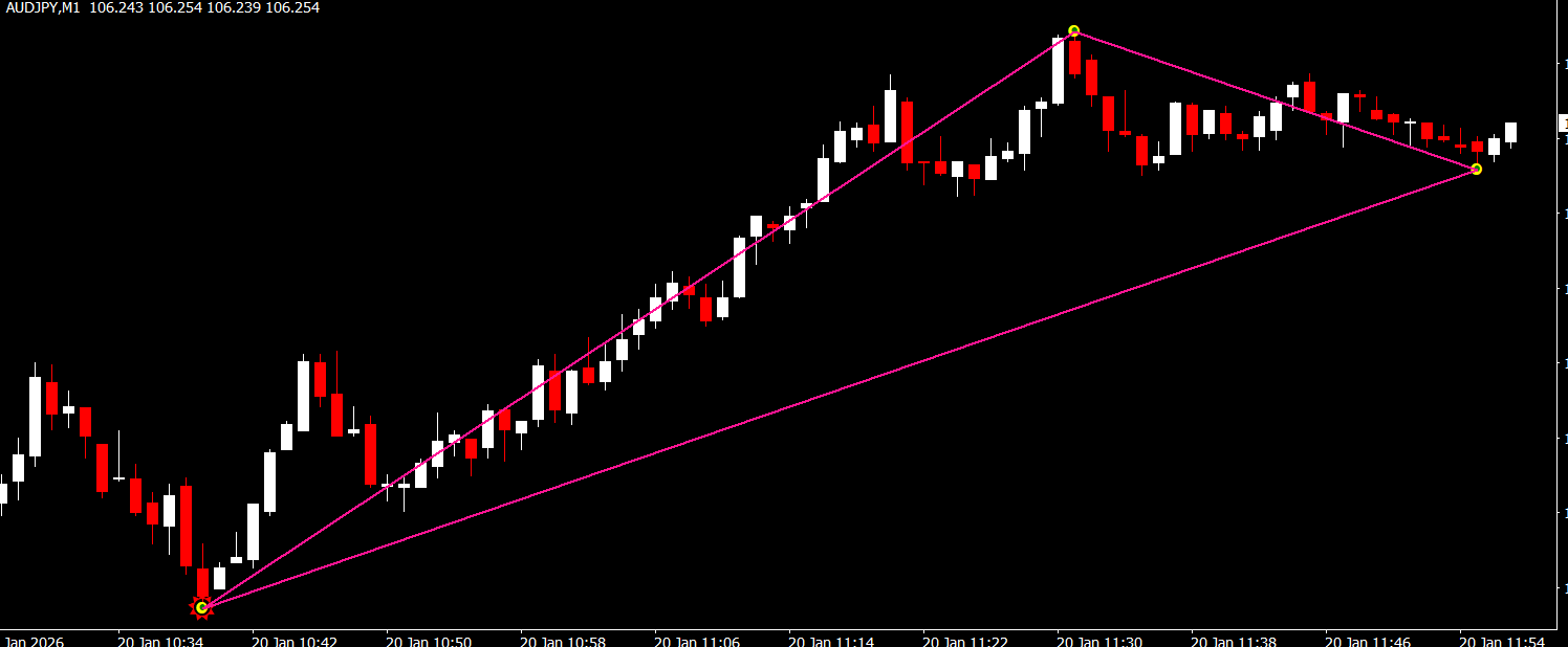 Triangles appear on the chart at potential reversal points. Traders can interpret these signals to anticipate changes in the market direction, helping them make timely trading decisions.