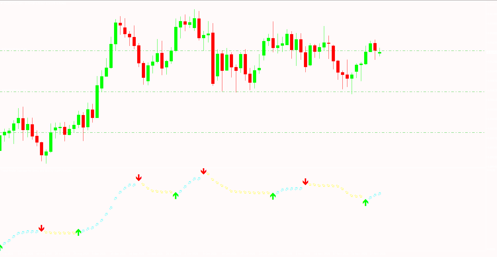 The indicator displays colored arrows to represent trading opportunities:
