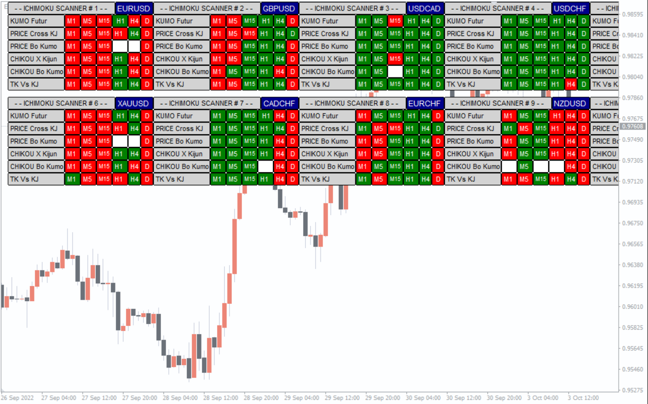 The indicator uses a built-in algorithm to analyze multiple Ichimoku elements on several timeframes at once. The results are displayed in a color-coded dashboard with green and red signals showing the direction of each component.