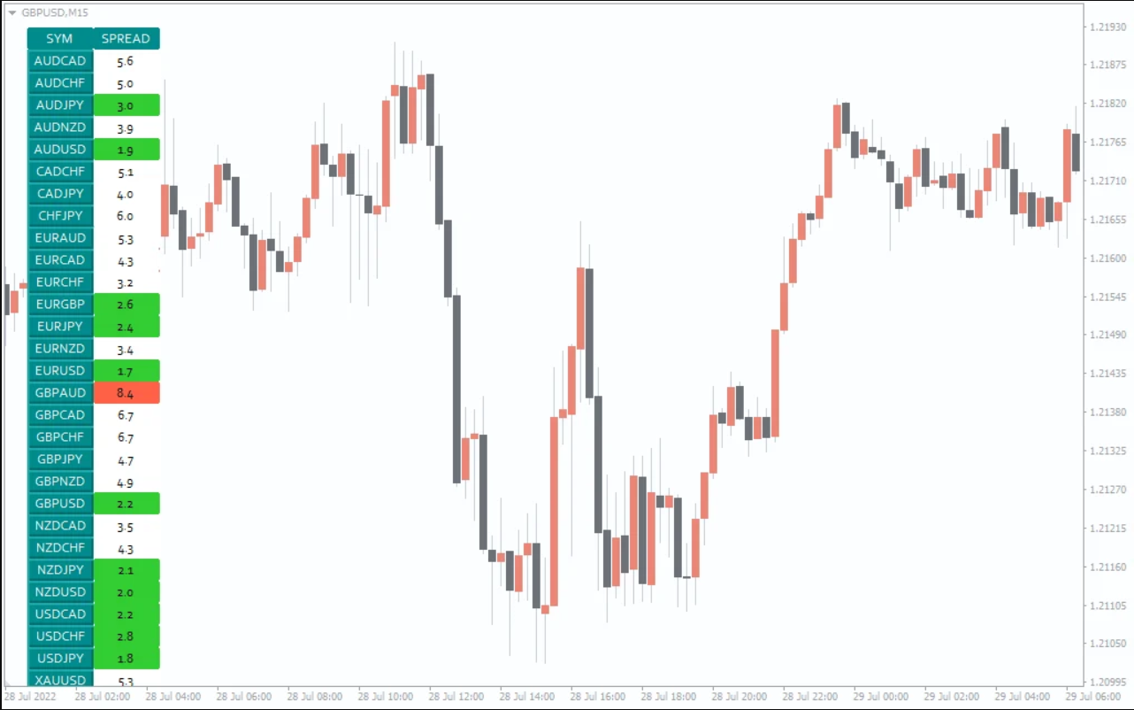 This indicator combines two critical utilities into one tool: a spread monitoring panel and a candle countdown timer.