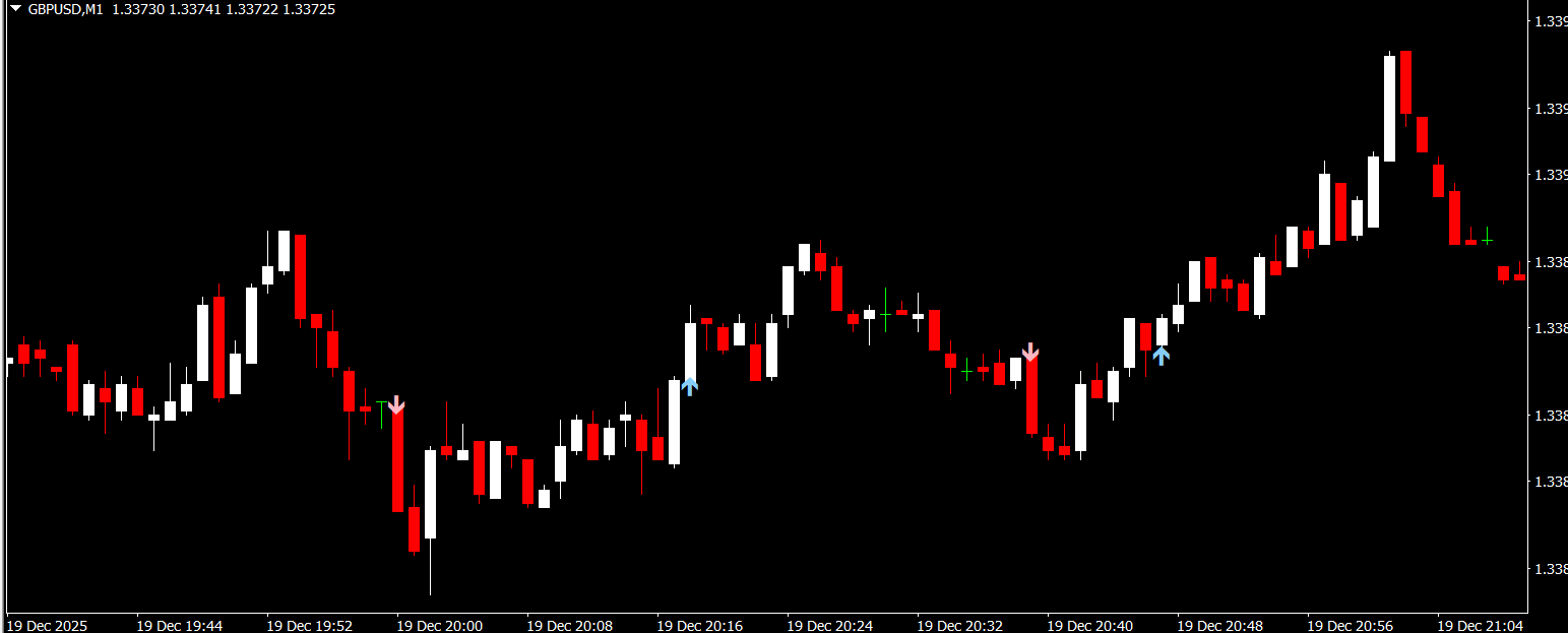Bullish arrows indicate potential buying opportunities when upward momentum begins to strengthen. Bearish arrows indicate possible selling opportunities when downward momentum is detected. The arrows are color-coded, making it easy for traders to instantly understand market direction without cluttering the chart.