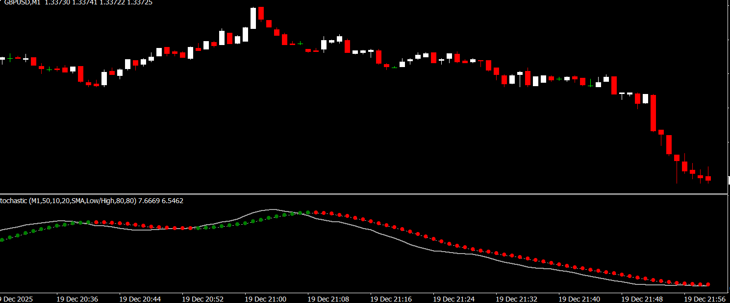 The indicator is based on the Stochastic Oscillator, a Momentum Indicator that measures the speed and direction of price movements. Instead of showing traditional oscillator lines in a separate window, this tool converts Stochastic signals into color-coded dots placed on the main chart.