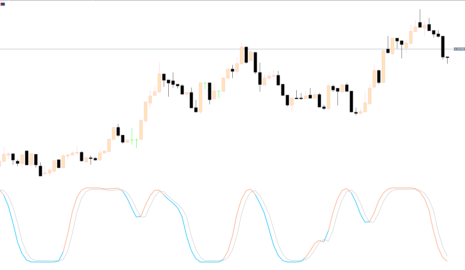 The indicator displays two lines—blue and orange—in a separate window. Trading signals are generated when these lines cross. The general strategy is to enter trades in the direction of the signal: