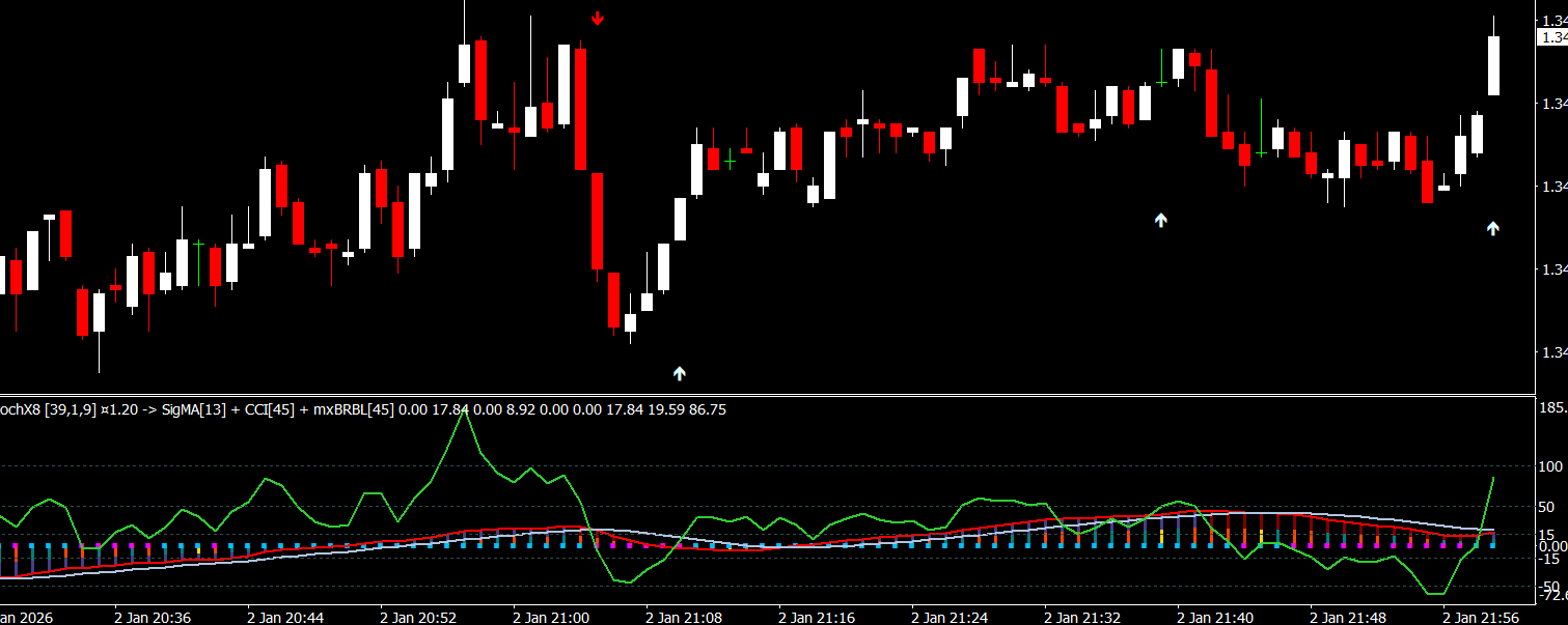 The indicator is also effective when combined with trend indicators, moving averages, or price action analysis to improve accuracy and reduce false entries.