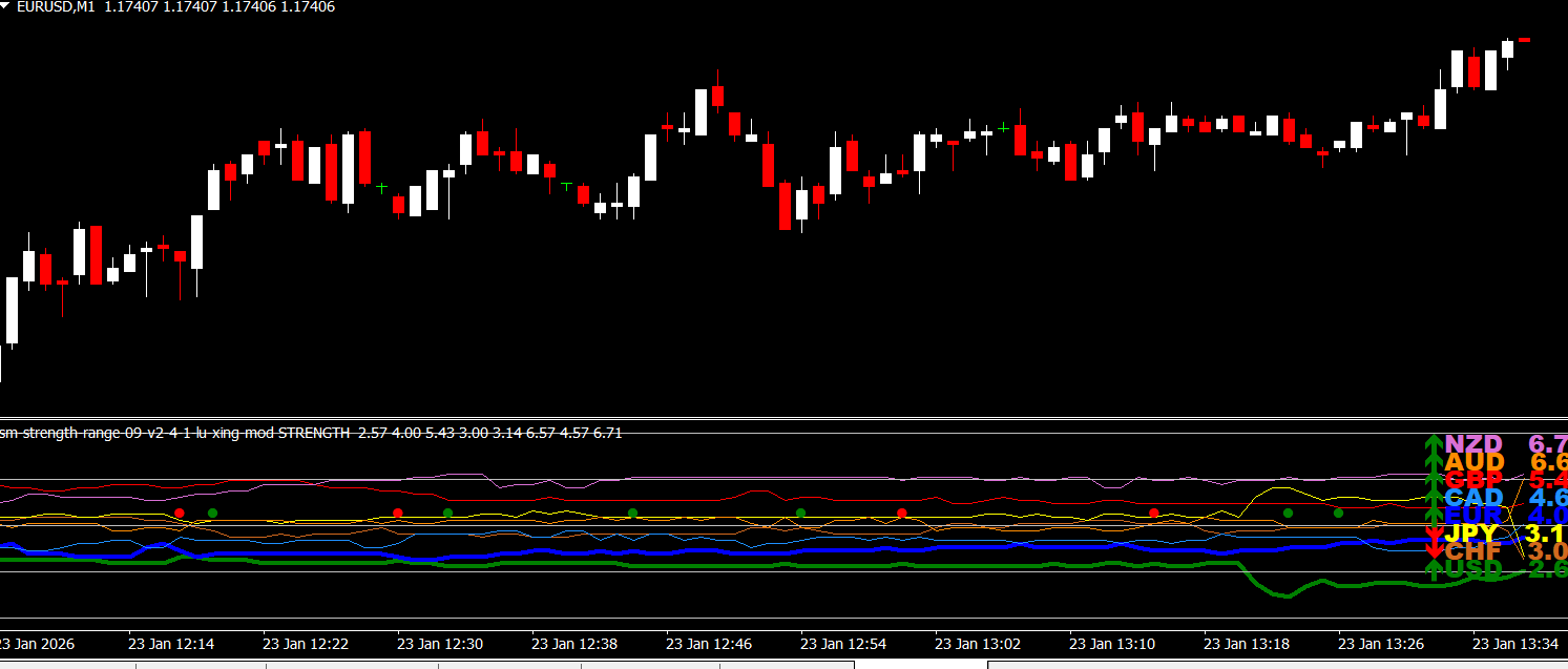 The SM Strength Range V2 Lu Xing Mod Indicator is a free and popular Forex Indicator for the MetaTrader 4 (MT4) trading platform. This indicator is especially useful for traders who want to measure the strength or weakness of a currency pair and make better trading decisions based on market momentum.