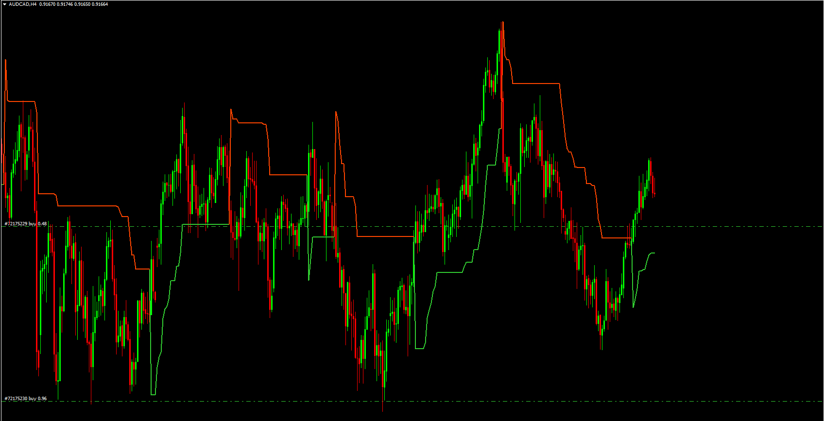 The indicator plots colored trend lines directly on the chart. A green line represents a bullish trend, while a red line represents a bearish trend. These visual signals allow traders to quickly identify the dominant market direction.