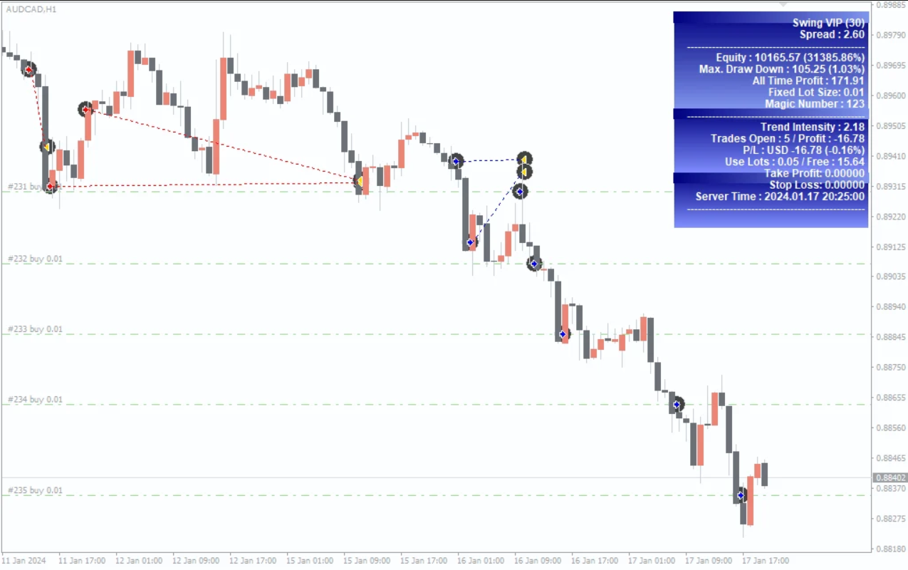 Swing VIP EA V2 operates based on professional swing trading methodologies. Instead of reacting to temporary price spikes, the EA waits for confirmed momentum and market structure alignment. It identifies retracement points, evaluates candlestick patterns, and confirms entries using trend intensity signals.