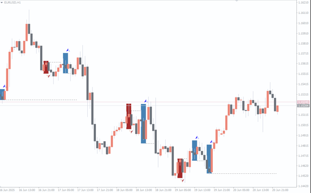 At the end of a pullback or downtrend, the indicator identifies a reversal pattern and marks it visually. Traders may enter long when the next candle confirms momentum.