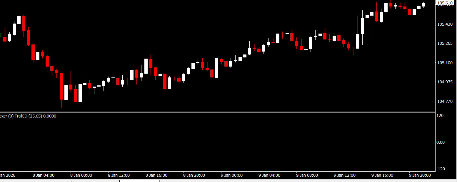 The Ticker Trail CD Indicator works by plotting a trailing line that closely follows price action. This line adapts to market movement and changes color based on the prevailing trend direction.