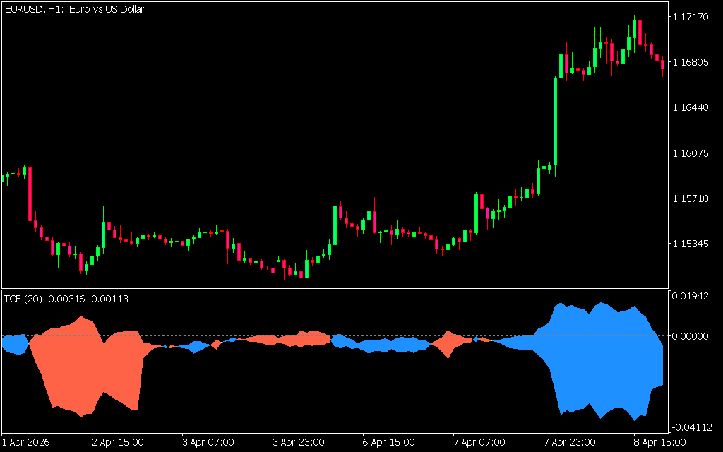 As seen in the EUR/USD H1 chart analysis, the TCF appears as a specialized sub-window oscillator, often characterized by distinct color-coded zones:
