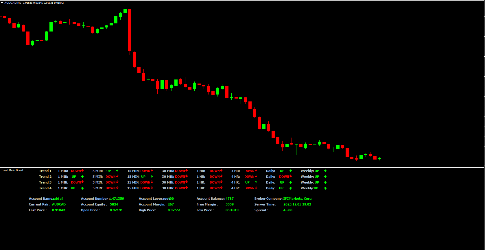 Beyond trend signals, the indicator displays detailed account and market information: