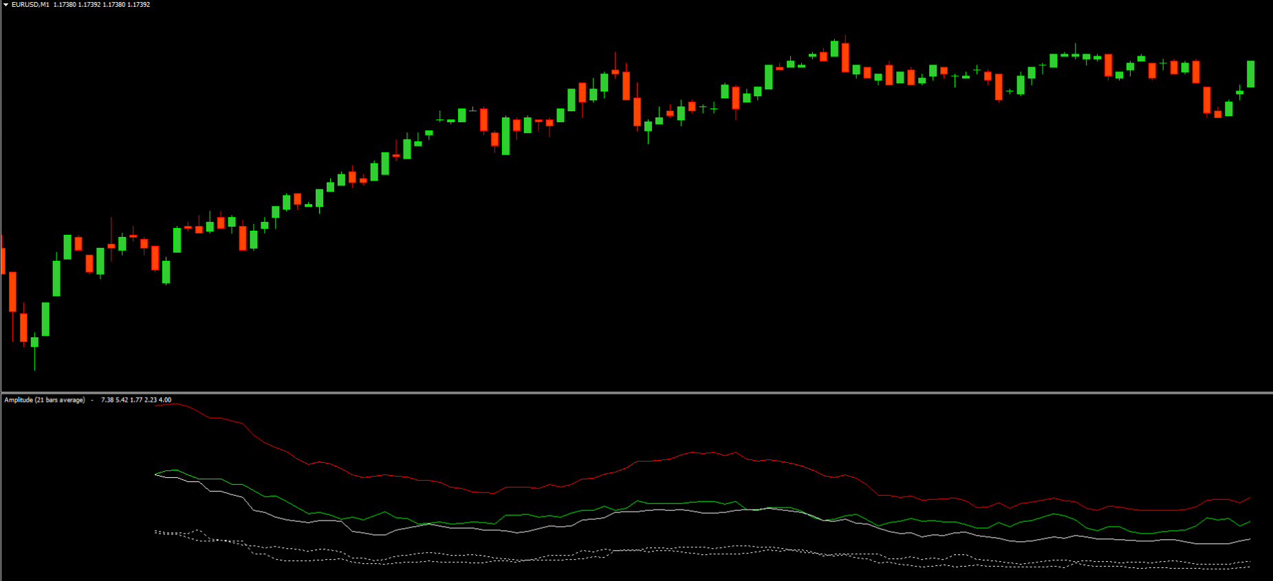 This indicator displays a colored signal line in a separate MT5 window. The signal line changes color and position depending on market strength and trend direction.