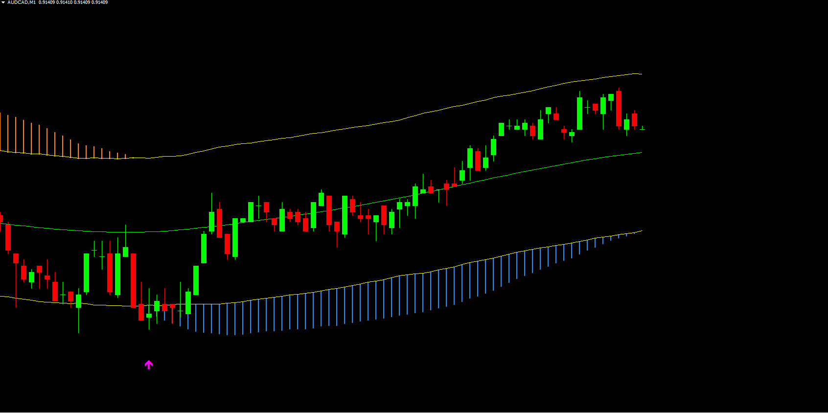 Bullish Trend: Dodger blue histogram bars appear while the bands slope upward
