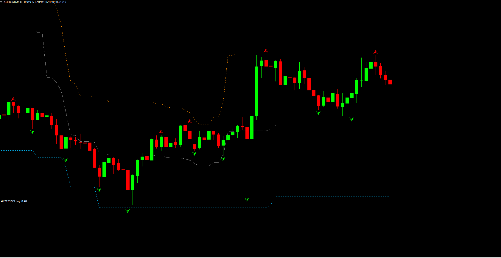 For a buying opportunity, wait until the price touches the lower extreme band and a green fractal arrow appears. Enter a long position only after a bullish candle closes, confirming price rejection. Place a stop-loss just below the fractal level, and consider taking profits when the price reaches the midline or when a red fractal appears.