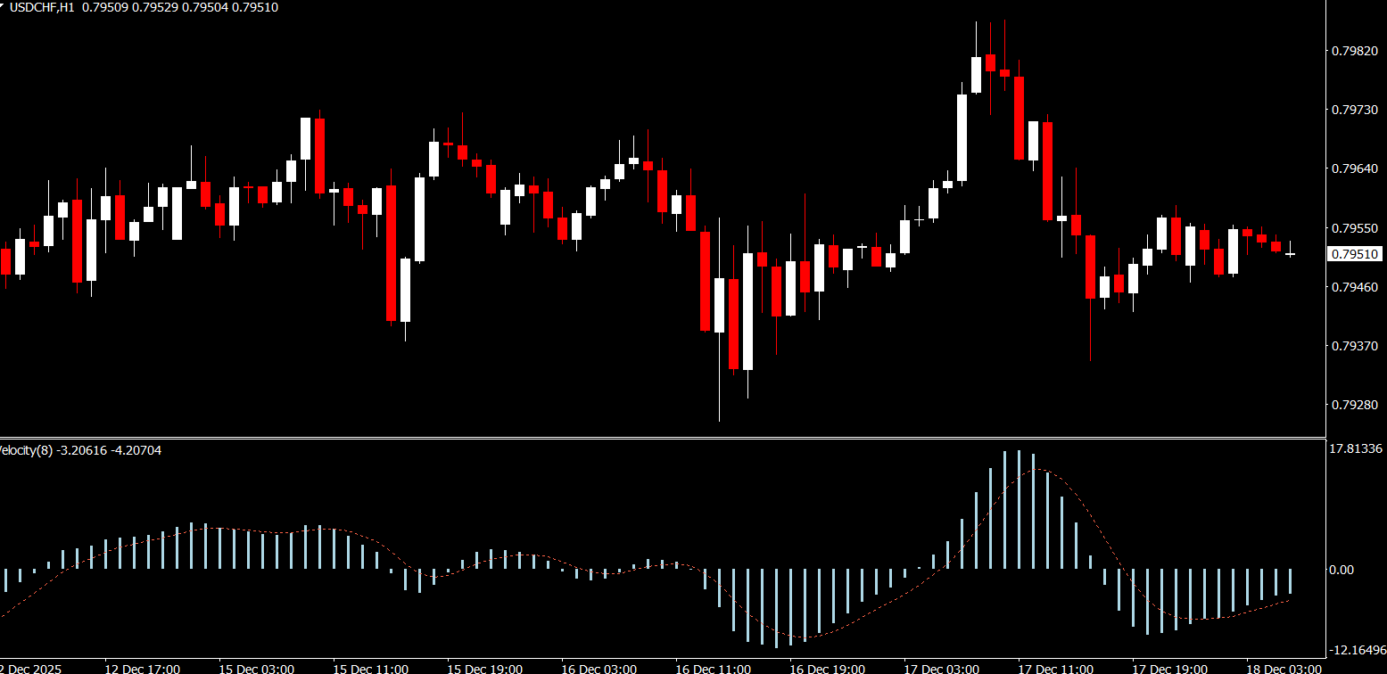 Once applied to an MT4 chart, the Velocity v2 Indicator begins analyzing price movement in real time.