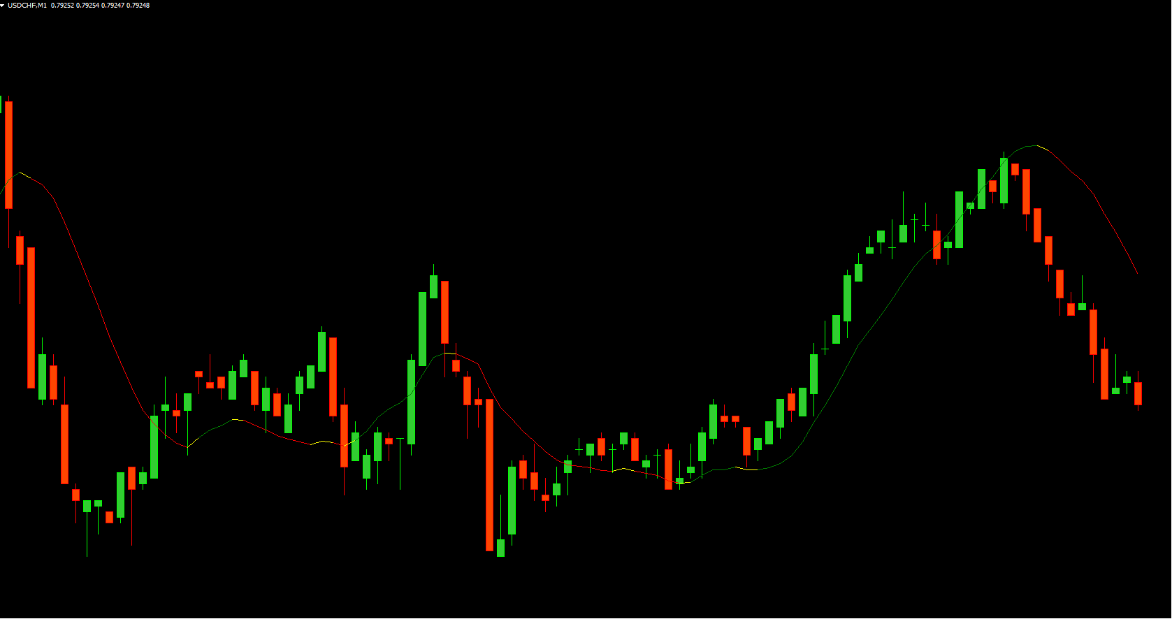 The Vinini LRMA Color Indicator for MT4 displays a dynamic colored line that shifts between green, yellow, and red, each representing a distinct market trend: