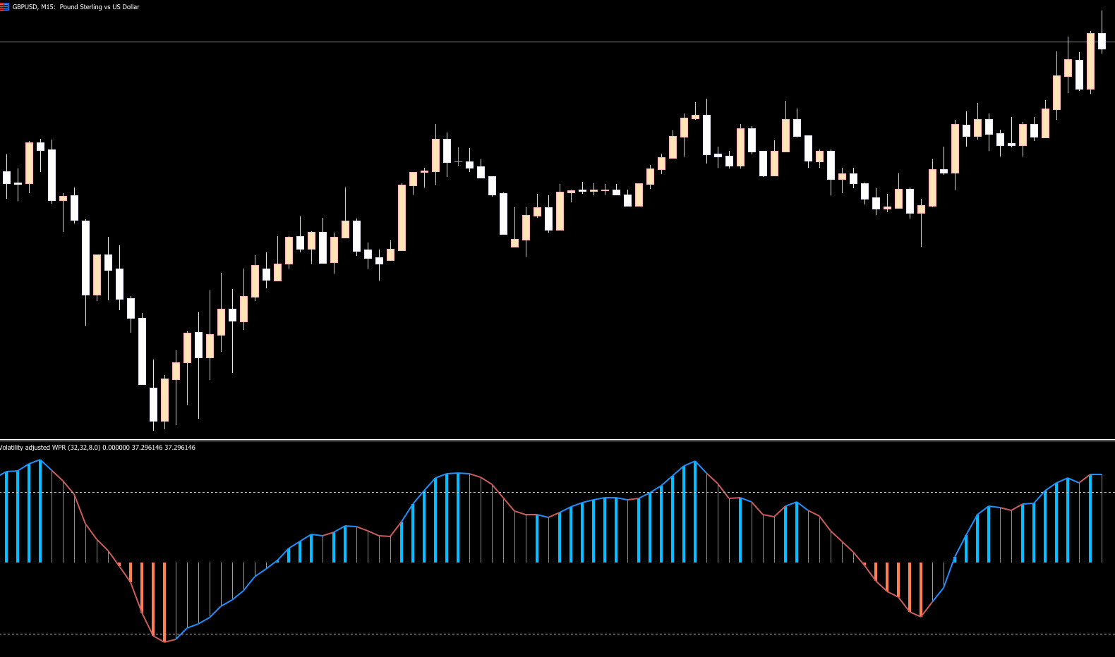 The indicator builds upon the traditional Williams Percent Range, a momentum oscillator that measures overbought and oversold levels. The Volatility Adjusted WPR Indicator enhances this by taking into account market volatility: