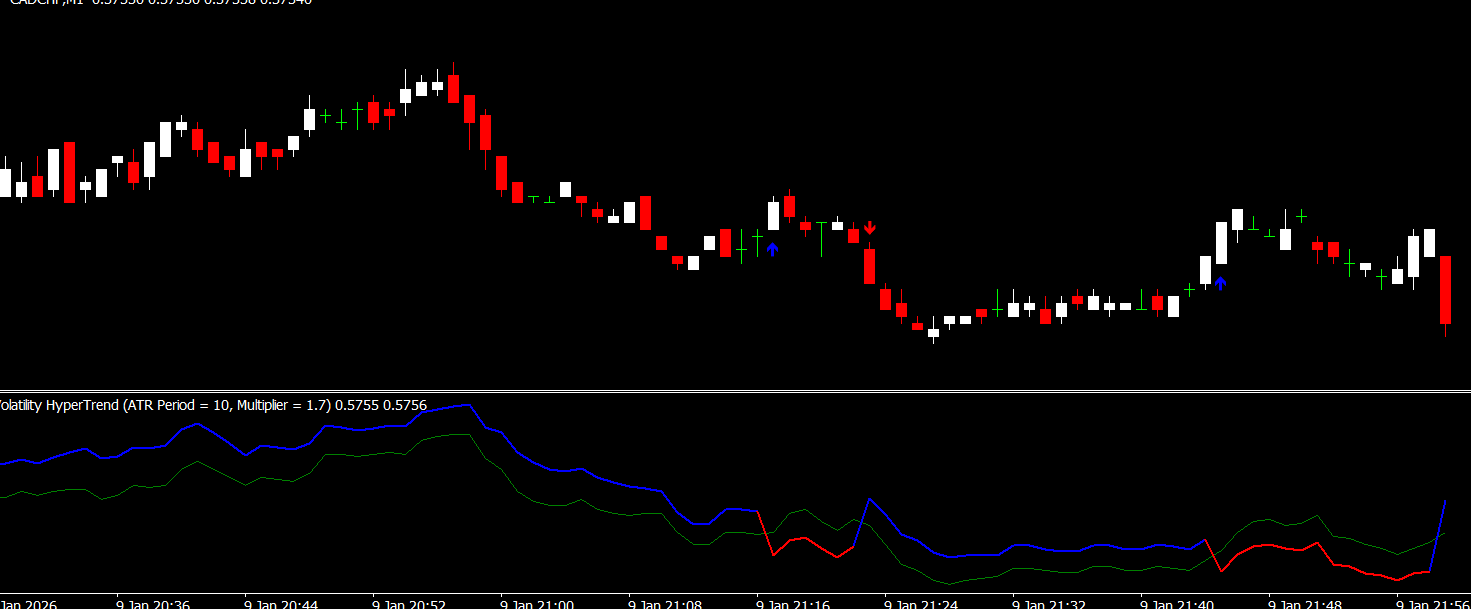 The main advantages of the Volatility Hypertrend forex indicator are its clarity, flexibility, and ease of use. However, like any technical tool, it should not be used in isolation. During extremely low-volatility periods, signals may be limited, and during high-impact news events, sudden volatility spikes can produce false signals.