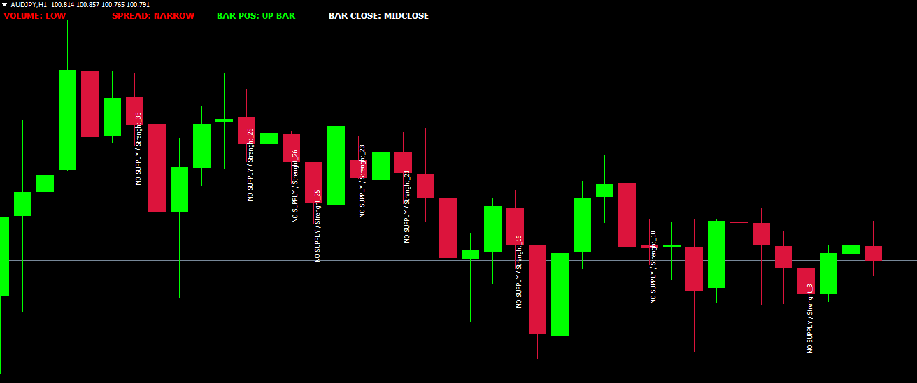 All relevant trading information — such as “No Demand” or “Effort to Move Down” — is displayed directly on your MT4 chart, allowing you to make faster decisions.