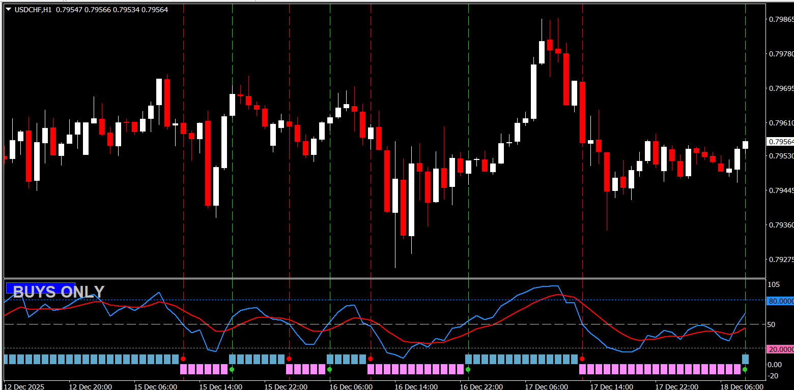 Buy signals – appear when the MA of RSI crosses upward, indicating upward momentum