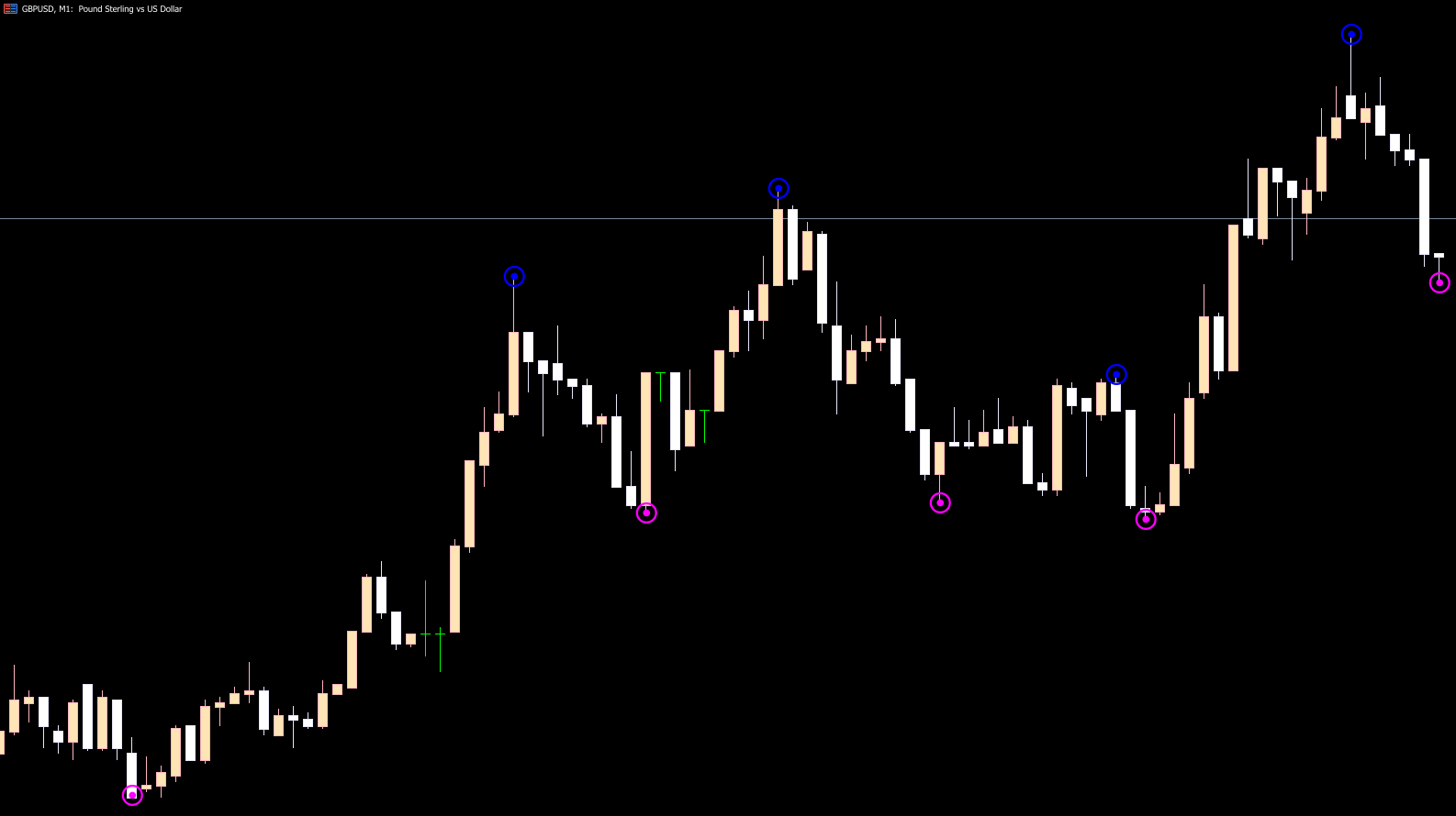 Using these swing points, the indicator draws blue and rose circles or arrows on the chart, showing traders where the market has shifted direction. These visual cues represent potential buy and sell opportunities aligned with broader market movements.