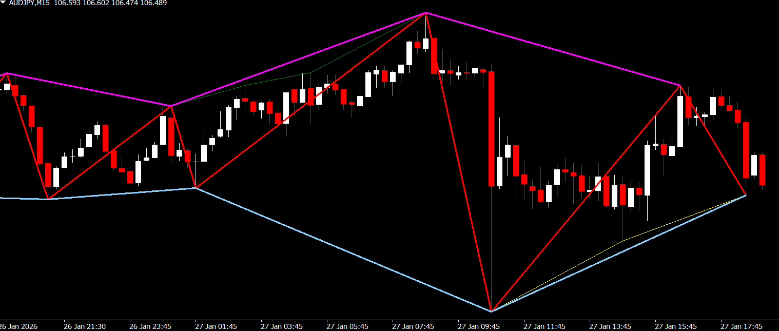 The indicator automatically analyzes price movements and plots: