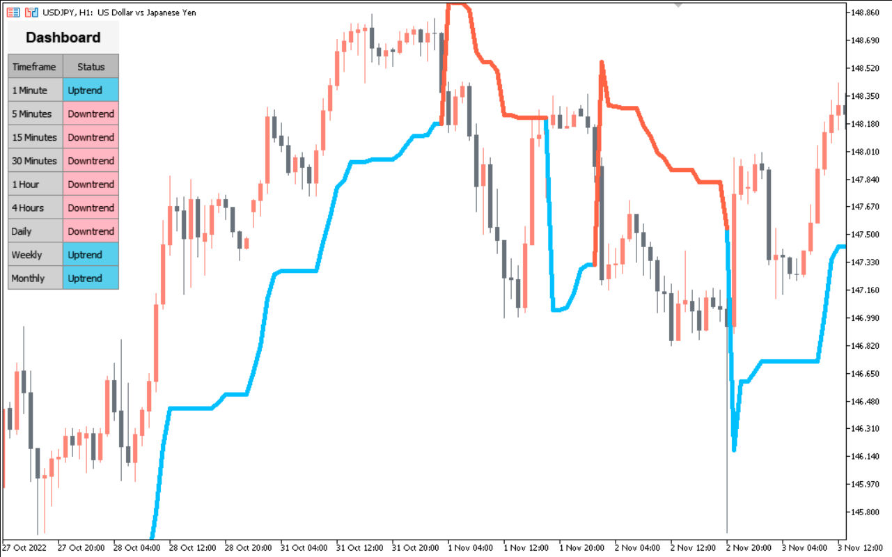 The indicator calculates trend direction using ATR and a multiplier to measure market volatility. A bullish trend is indicated when the price stays above the signal line, while a bearish trend is detected when the price remains below the signal line. The multi-timeframe toolbar allows traders to instantly see whether shorter-term trends align with longer-term trends, providing a strong confluence signal.