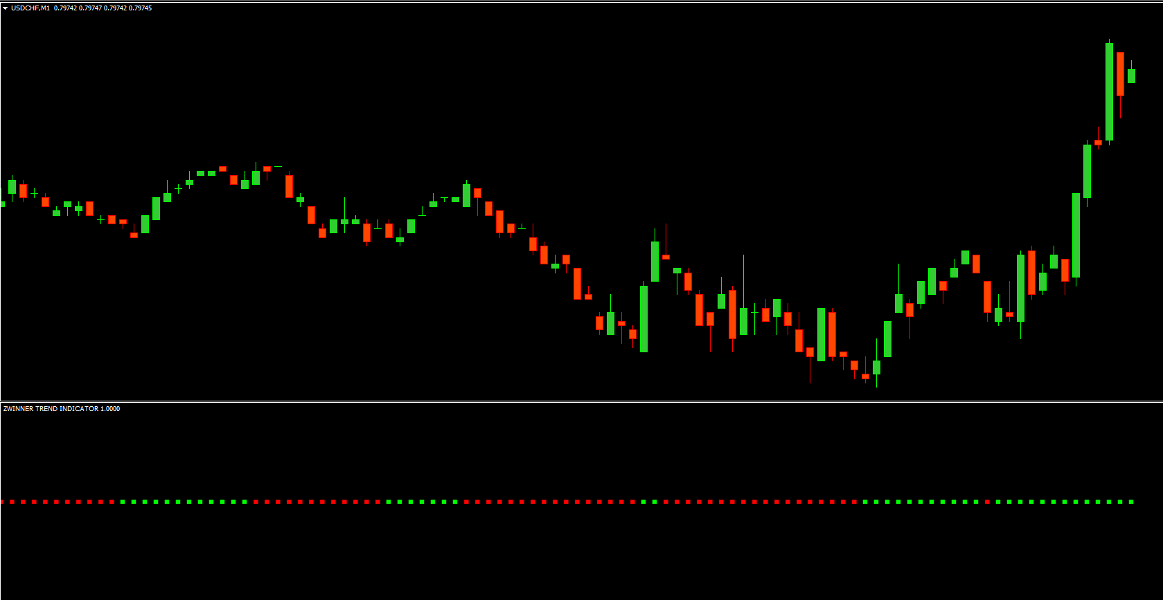 The Zwinner Trend Indicator uses a color-coded system to display market direction. When green bars appear, it indicates a bullish trend, signaling a potential buying opportunity. Conversely, red bars represent a bearish trend, suggesting that selling or shorting positions might be more favorable.